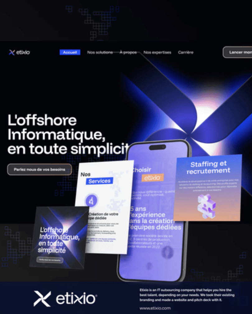 We recently partnered with Etixio, a trusted IT outsourcing company providing access to top tech talent.Our job? Taking their solid existing brand identity and transforming it into two essential conversion tools: a high-impact website and a compelling pitch deck.